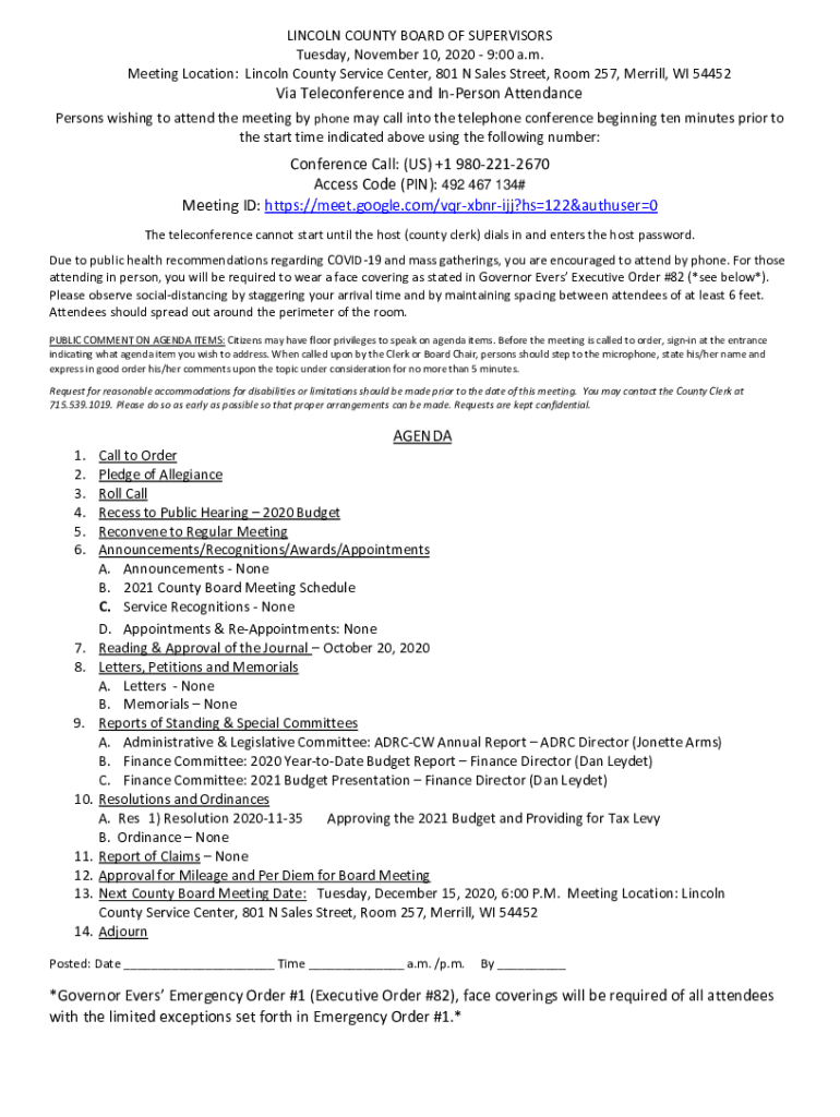 LINCOLN COUNTY BOARD OF SUPERVISORS Tuesday, November 10, 2020 9:00 a.m. Meeting Location: Lincoln County Service Center, 801 N Sales Street, Room 257, Merrill, WI 54452Via Teleconference and Unperson