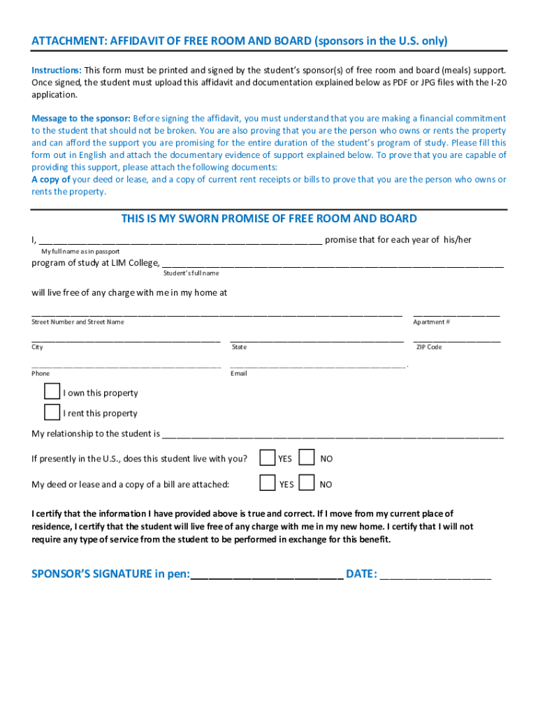 ATTACHMENT: AFFIDAVIT OF FREE ROOM AND BOARD (sponsors in the U.S. only) Instructions: This form must be printed and signed by the students sponsor(s) of free room and board (meals) support. Once
