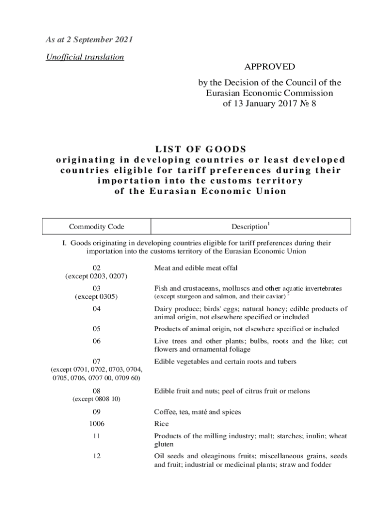 As at 2 September 2021 Unofficial translationAPPROVED by the Decision of the Council of the Eurasian Economic Commission of 13 January 2017 8LIST OF GOODS originating in developing countries or least