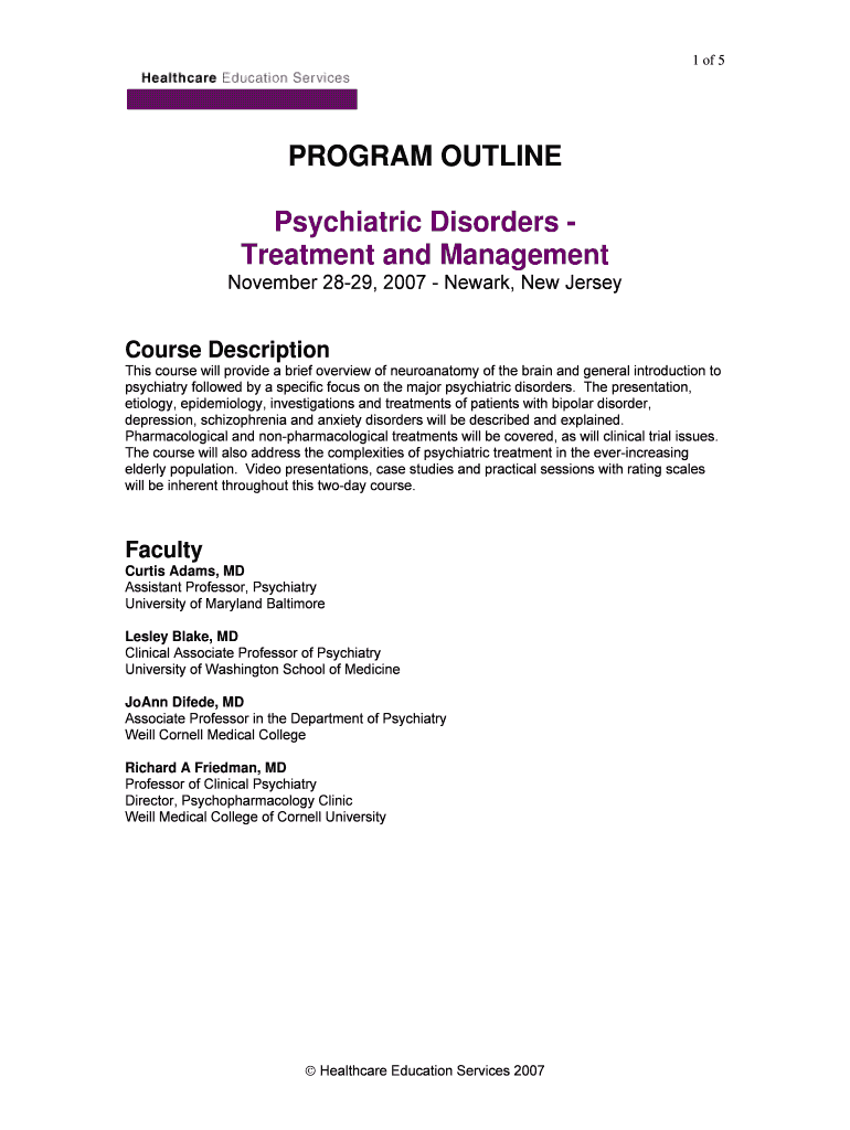 1 of 5 PROGRAM OUTLINE Psychiatric Disorders Treatment and Management November 2829, 2007 Newark, New Jersey Course Description This course will provide a brief overview of neuroanatomy of the brain