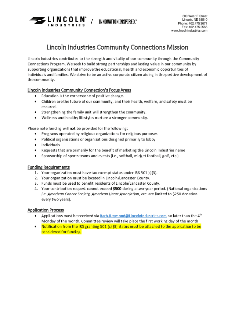 Start by visiting the Lincoln Industries website or contacting their community relations department for the necessary forms.