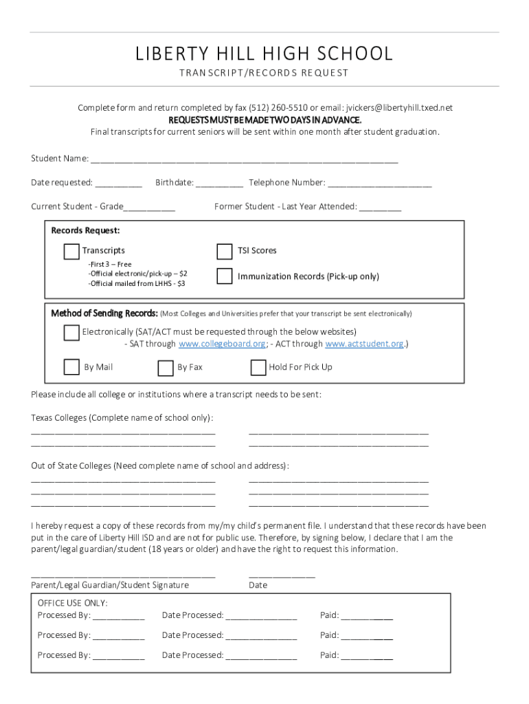 LIBERTY HILL HIGH SCHOOL TRANSCRIPT/RECORDS REQUEST Complete form and return completed by fax (512) 2605510 or email: jvickers@libertyhill.txed.net REQUESTS MUST BE MADE TWO DAYS IN ADVANCE. Final