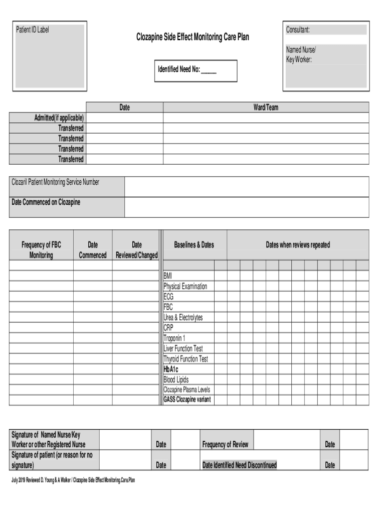 Patient ID LabelConsultant:Clozapine Side Effect Monitoring Care Planned Nurse/