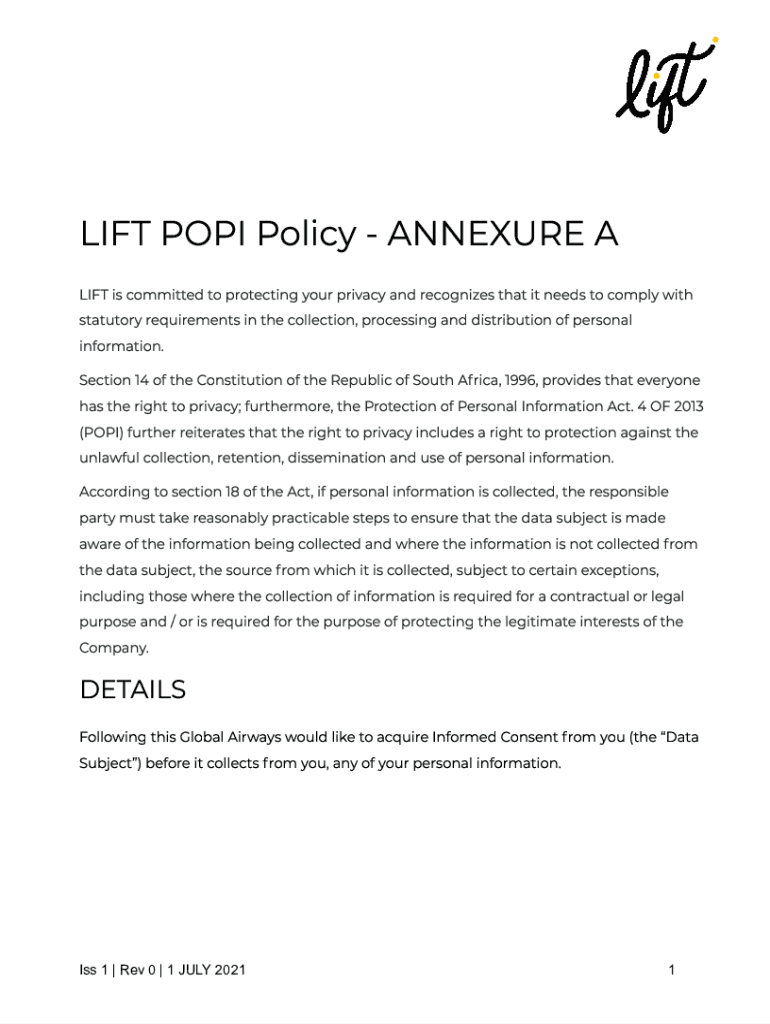 LIFTPOPIPolicyANNEXUREA LIFTiscommittedtoprotectingyourprivacyandrecognizesthatitneedstocomplywith statutoryrequirementsinthecollection, processinganddistributionofpersonal information. Section14oftheConstitutionoftheRepublicofSouthAfrica,1996,provides