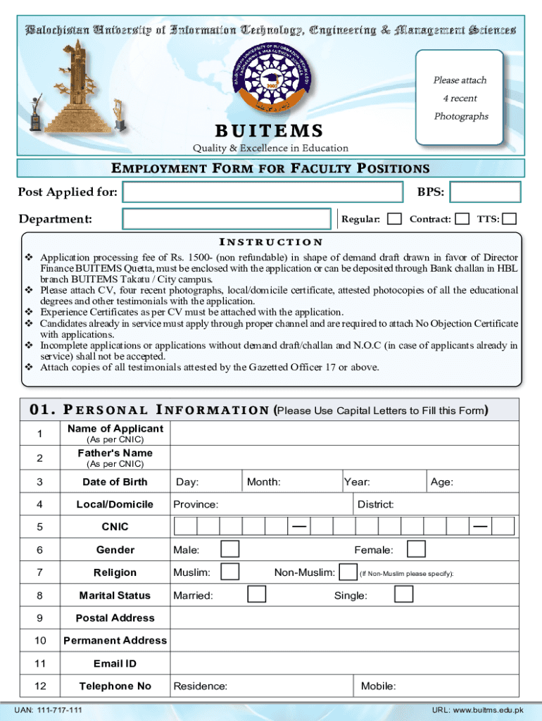 Balochistan University of Information Technology, Engineering & Management SciencesBUITEMS E EMPLOYMENT F ORM FOR F FACULTY P POSITIONS Post Applied for:BPS:Department: v v v v v regular:Contract:TTS:INSTRUCTION