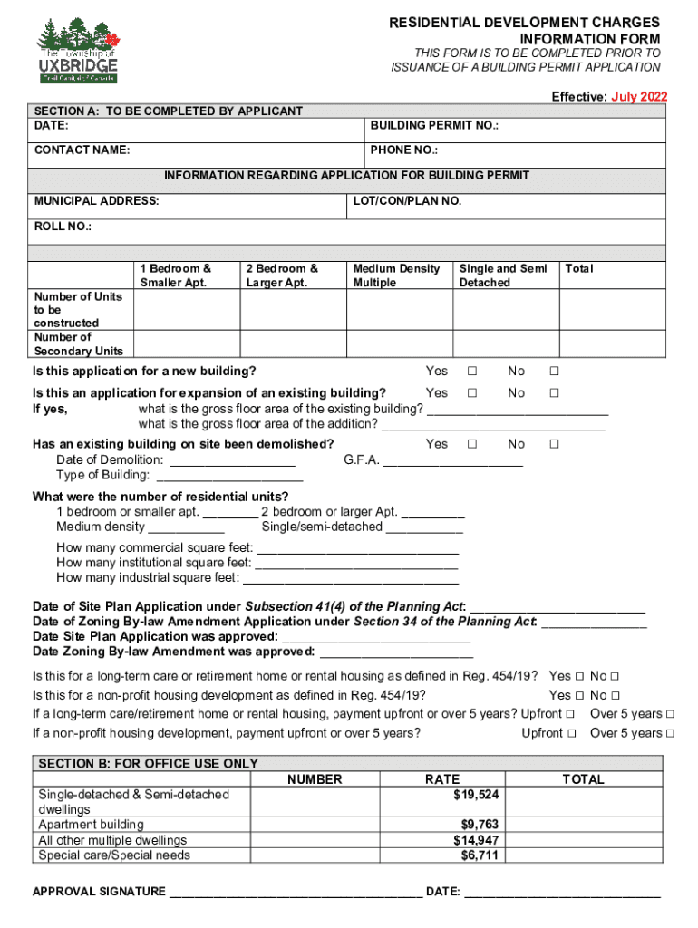 RESIDENTIAL DEVELOPMENT CHARGES INFORMATION FORM THIS FORM IS TO BE COMPLETED PRIOR TO ISSUANCE OF A BUILDING PERMIT APPLICATIONEffective: July 2022 SECTION A: TO BE COMPLETED BY APPLICANT DATE:BUILDING