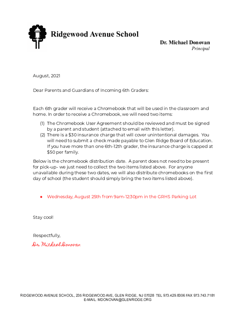 Ridge wood Avenue School Dr. Michael Donovan Principal August 2021 Dear Parents and Guardians of Incoming 6th Graders:Each 6th grader will receive a Chromebook that will be used in the classroom and