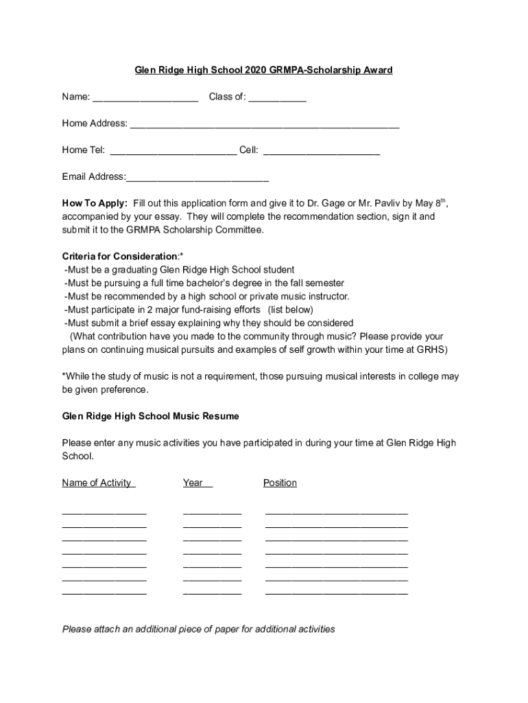 Glen Ridge High School 2020 GRMPAScholarship Award Name: ___Class of: ___Home Address: ___ Home Tel: ___ Cell: ___ Email Address:___ How To Apply: Fill out this application form and give it to Dr.