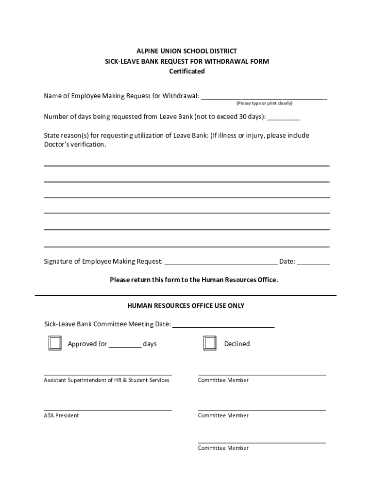 ALPINE UNION SCHOOL DISTRICT SICKLE AVE BANK REQUEST FOR WITHDRAWAL FORM Certificated Name of Employee Making Request for Withdrawal: ___ (Please type or print clearly)Number of days being requested