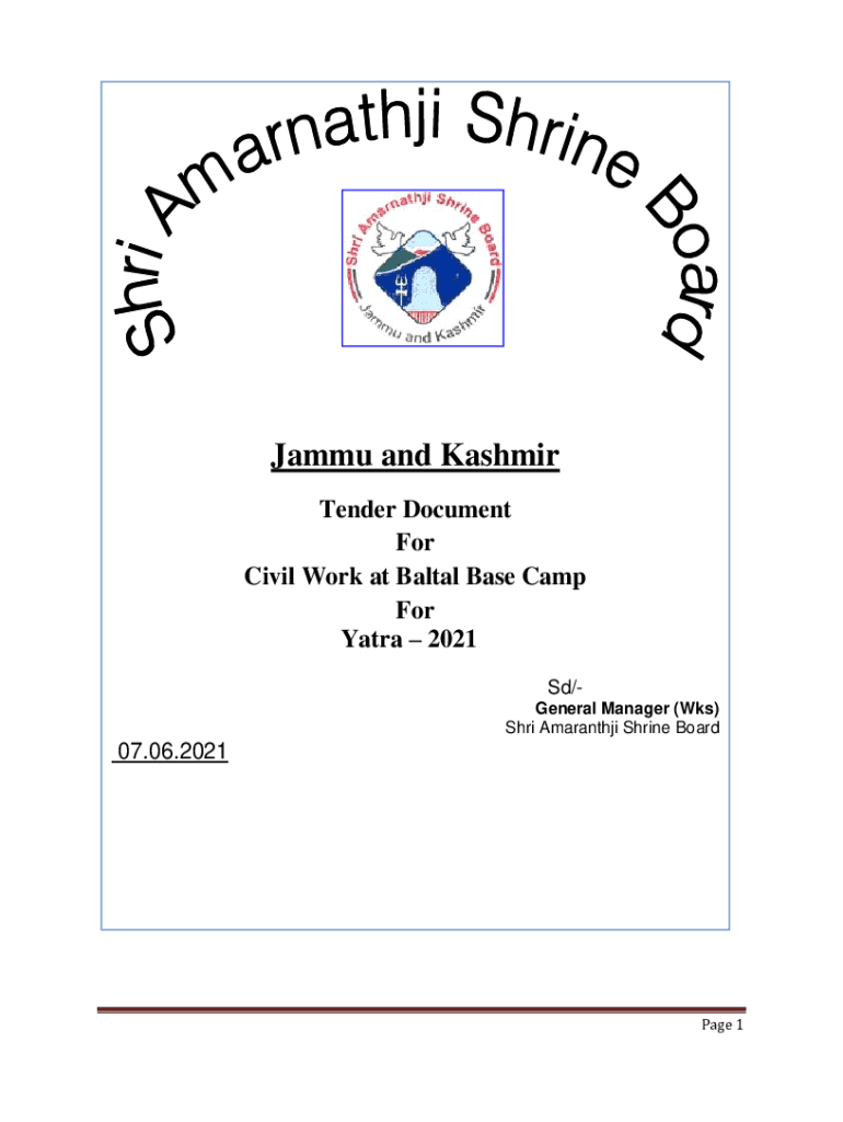 Jammy and Kashmir Tender Document For Civil Work at Ball Base Camp For Tatra 2021 SD/General Manager (Was) Sari Amaranth Shrine Board07.06.2021Page 1CIVIL WORK AT BALL BASE CAMP FOR TATRA 2021 NOTICE