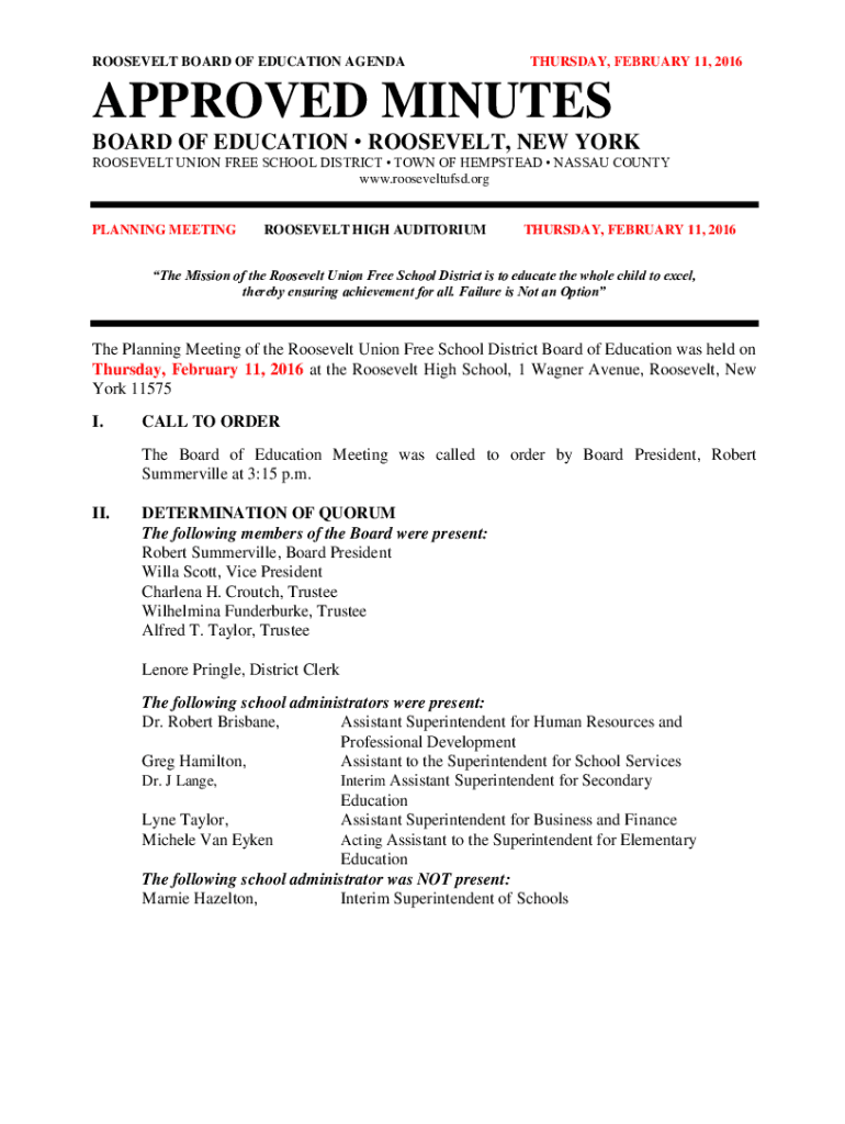 ROOSEVELT BOARD OF EDUCATION AGENDATHURSDAY, FEBRUARY 11, 2016APPROVED MINUTES