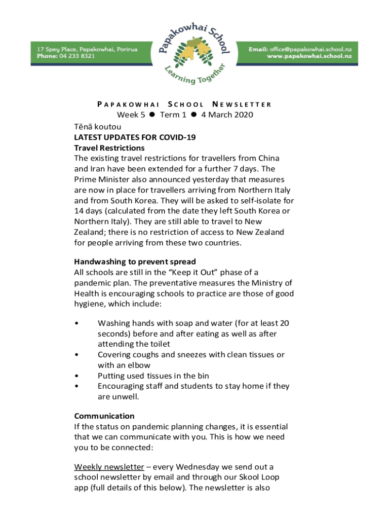 PAPAKOWHAI SCHOOL NEWSLETTER Week 5 Term 1 4 March 2020 Tn Mouton The LATEST UPDATES FOR COVID-19 Travel Restrictions The existing travel restrictions for travelers from China and Iran have been extended