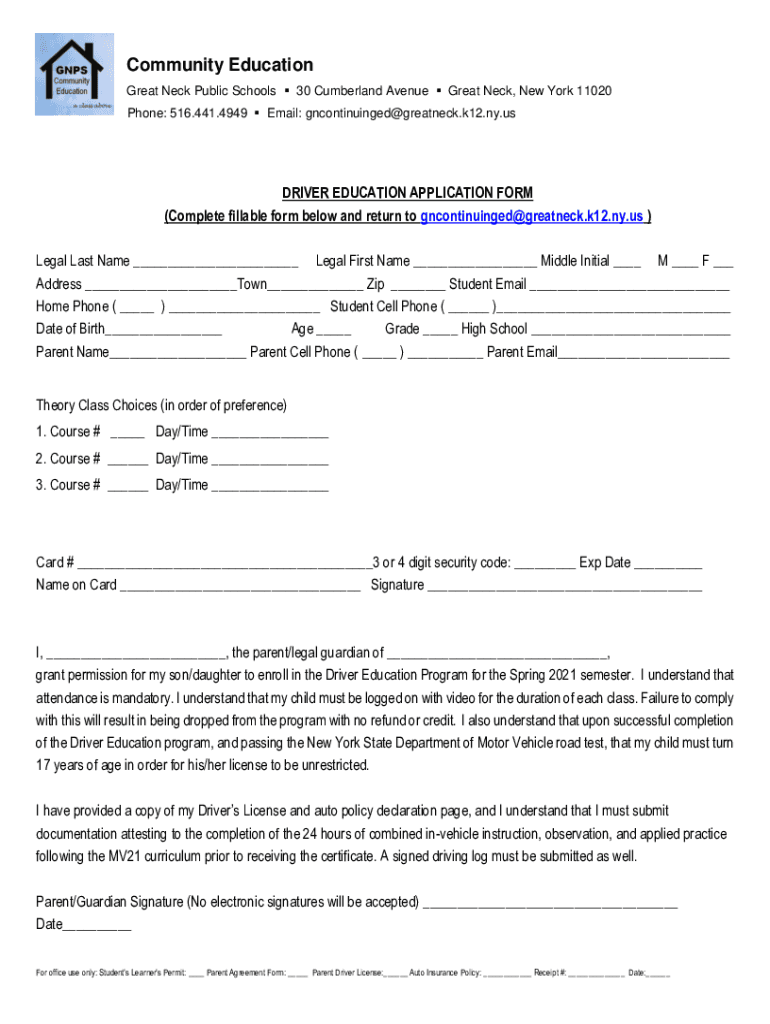 Community Education Great Neck Public Schools 30 Cumberland Avenue Great Neck, New York 11020 Phone: 516.441.4949 Email: gncontinuinged@greatneck.k12.ny.usNEW YORK STATEAPPROVED DRIVER EDUCATION FOR