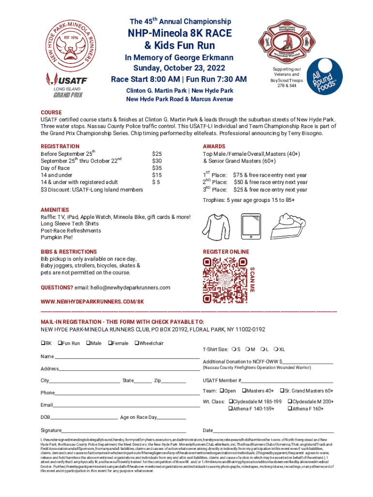 The 45th Annual ChampionshipNHPMineola 8K RACE & Kids Fun Run In Memory of George Bergmann Sunday, October 23, 2022, Race Start 8:00 AM | Fun Run 7:30 Supporting our Veterans and Boy Scout Troops