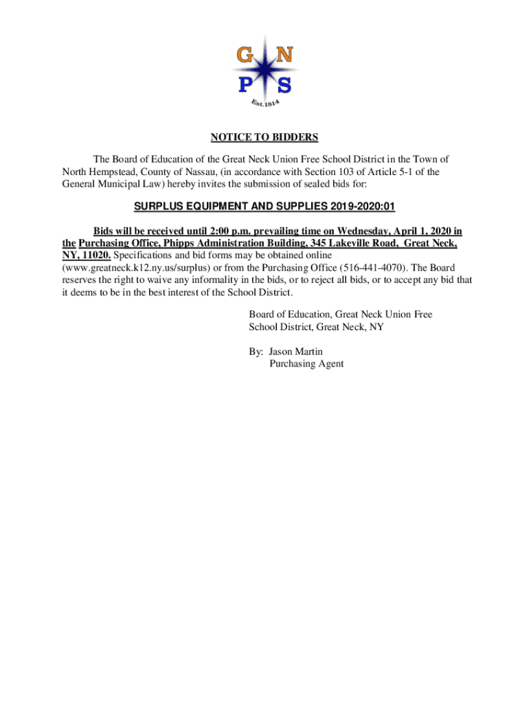 NOTICE TO BIDDERS The Board of Education of the Great Neck Union Free School District in the Town of North Hempstead, County of Nassau, (in accordance with Section 103 of Article 51 of the General