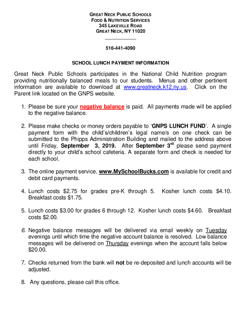 GREAT NECK PUBLIC SCHOOLS FOOD & NUTRITION SERVICES 345 LAKEVILLE ROAD GREAT NECK, NY 11020 ___ 5164414090 SCHOOL LUNCH PAYMENT INFORMATIONGreat Neck Public Schools participates in the National Child