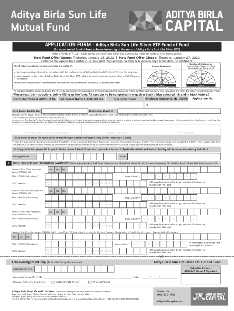 APPLICATION FORM Aditya Barley Sun Life Silver ETF Fund of Fund (An open-ended fund of fund scheme investing in the units of Aditya Barley Sun Life Silver ETF)Offer of units of 10/ each during the