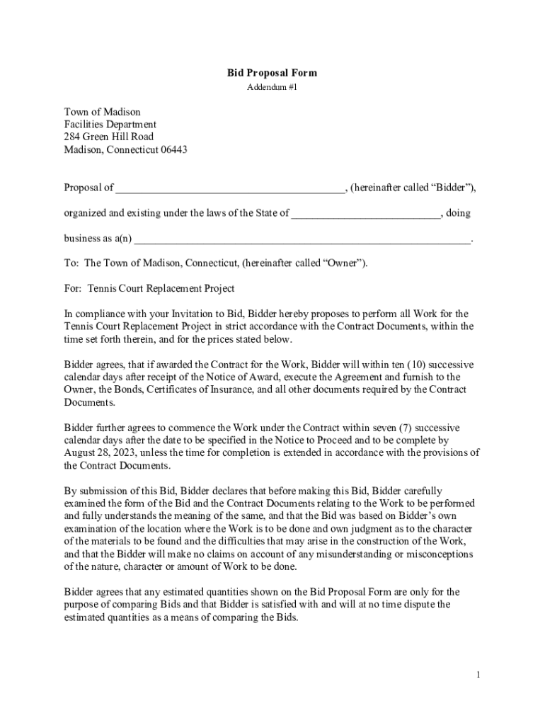 Bid Proposal Form Addendum #1Town of Madison Facilities Department 284 Green Hill Road Madison, Connecticut 06443Proposal of ___, (hereinafter called Bidder), organized and existing under the laws