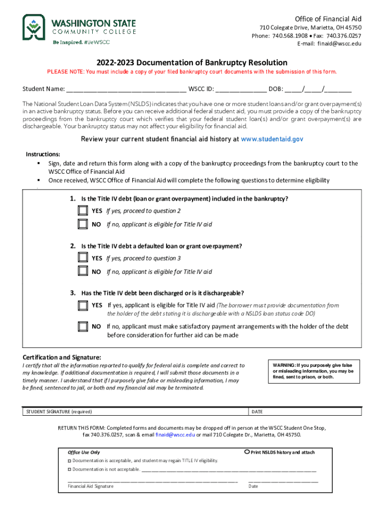 Email: finaid@wscc.edu20222023 Documentation of Bankruptcy Resolution