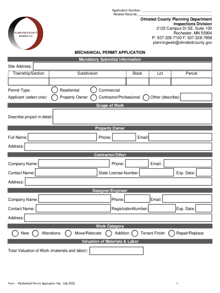 Application Number:___ Related Records:___Olmsted County Planning Department Inspections Division 2122 Campus Dr SE, Suite 100 Rochester, MN 55904 P: 5073287100 F: 5073287958 planningweb@olmstedcounty.gov
