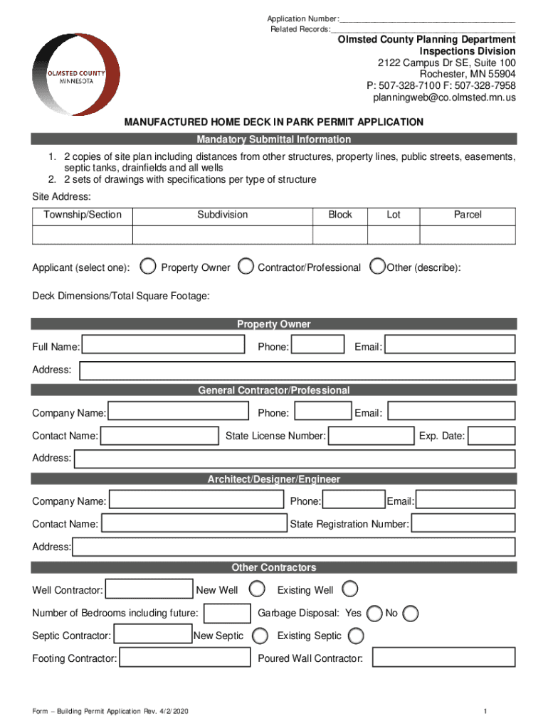 Application Number:___ Related Records:___Olmsted County Planning Department Inspections Division 2122 Campus Dr SE, Suite 100 Rochester, MN 55904 P: 5073287100 F: 5073287958 planningweb@co.olmsted.mn.us