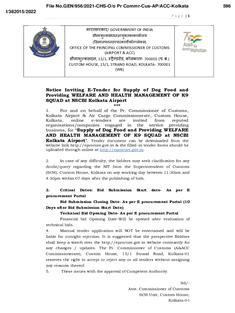 File No.GEN/956/2021CHSO/o Pr CommrCusAP/Kolkata I/382015/2022 P a g e |1/ GOVERNMENT OF INDIA ()OFFICE OF THE PRINCIPAL COMMISSIONER OF CUSTOMS (AIRPORT & ACC), 15/1, 700001 (
