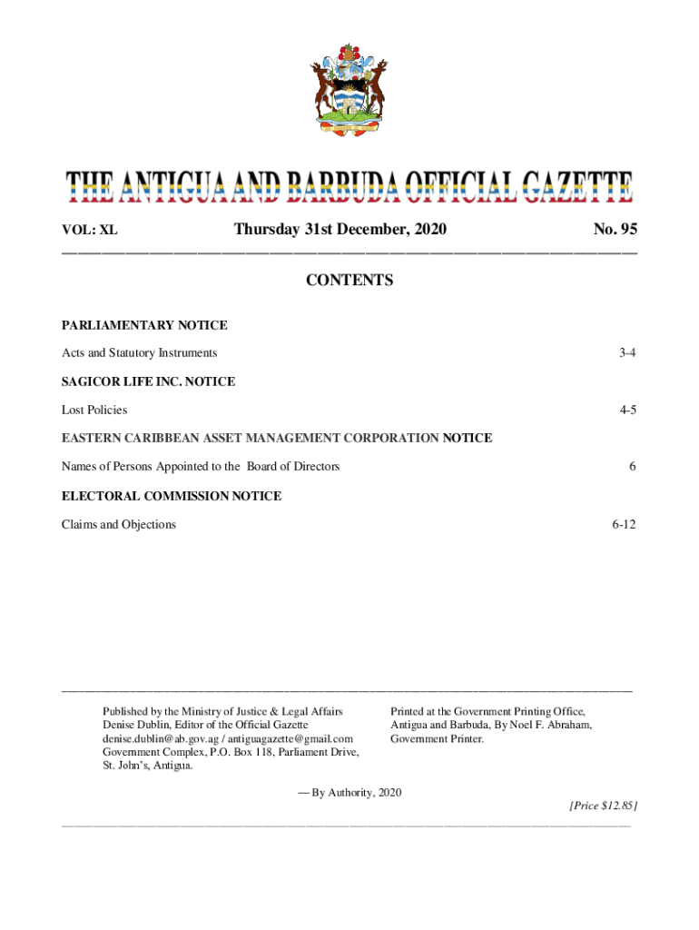 Thursday 31st December 2020 No. 95 ___ VOL: CONTENTS PARLIAMENTARY NOTICE Acts and Statutory Instruments34SAGICOR LIFE INC. NOTICE Lost Policies45EASTERN CARIBBEAN ASSET MANAGEMENT CORPORATION NOTICE
