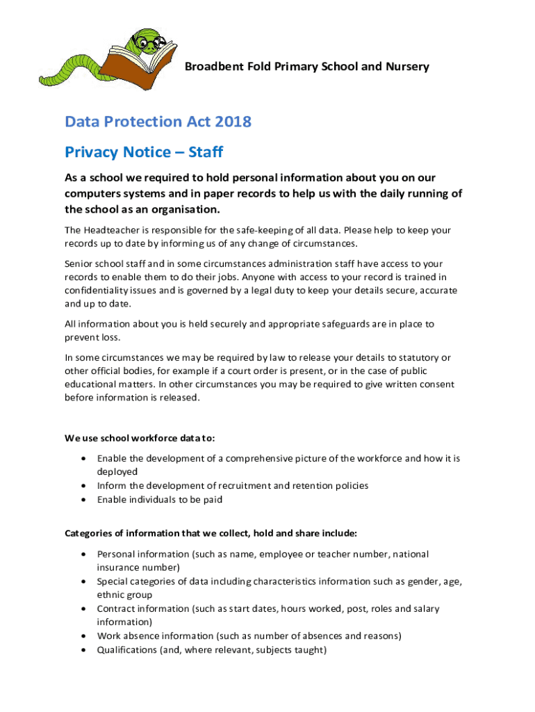 Broad bent Fold Primary School and Nurseryman Protection Act 2018 Privacy Notice Staff As a school we required to hold personal information about you on our computers systems and in paper records