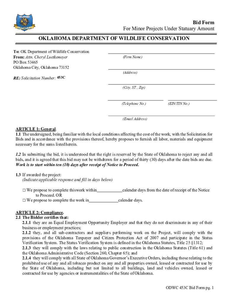 Solicitation Cover Page For Minor Projects Under Statuary Amount OKLAHOMA DEPARTMENT OF WILDLIFE CONSERVATION DATE OF SOLICITATION made as of the 29h day of July in the year 2021 Solicitation Information