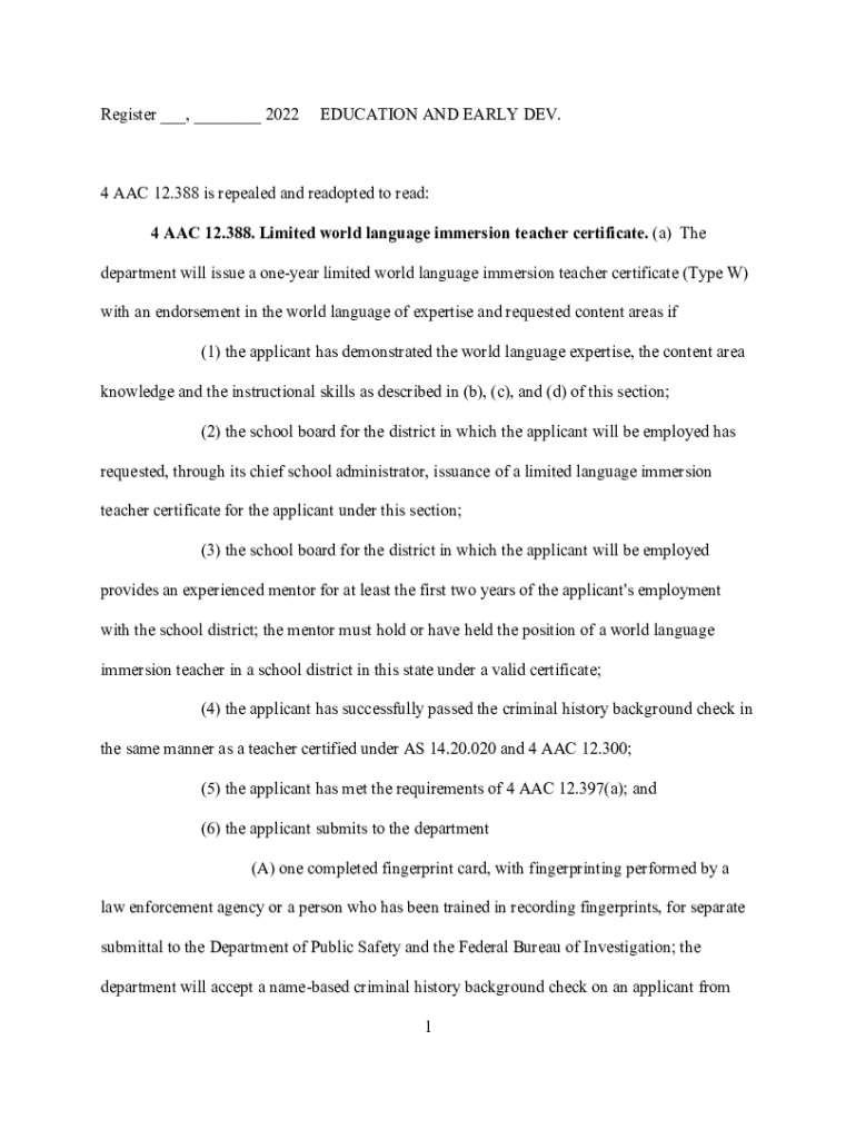 Register ___, ___ 2022EDUCATION AND EARLY DEV.4 AAC 12.388 is repealed and readopted to read: 4 AAC 12.388. Limited world language immersion teacher certificate. (a) The department will issue a one-year