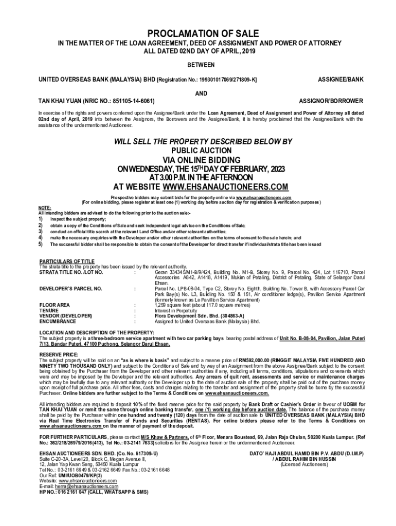 PROCLAMATION OF SALE IN THE MATTER OF THE LOAN AGREEMENT, DEED OF ASSIGNMENT AND POWER OF ATTORNEY ALL DATED 02ND DAY OF APRIL 2019 BETWEEN UNITED OVERSEAS BANK (MALAYSIA) BHD [Registration No.: 199301017069/271809K]