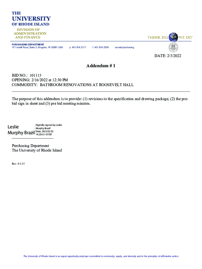 PREUNIVERSITY OF RHODE ISLAND DIVISION OF ADMINISTRATION AND FINANCE PURCHASING DEPARTMENT 10 To tell Road, Suite 3, Kingston, RI 02881 USA: 401.874.2171f: 401.874.2306uri.edu/purchasingDATE: 2/3/2022Addendum