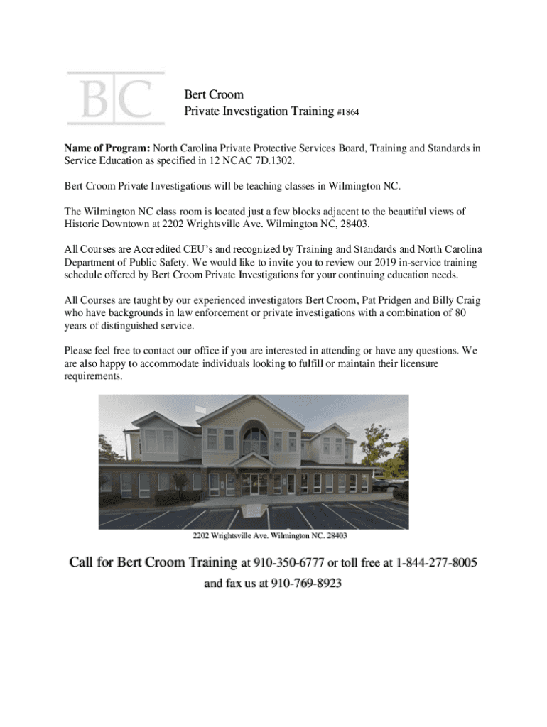 Bert Crew Private Investigation Training #1864 Name of Program: North Carolina Private Protective Services Board, Training and Standards in Service Education as specified in 12 NCAA 7D.1302. Bert