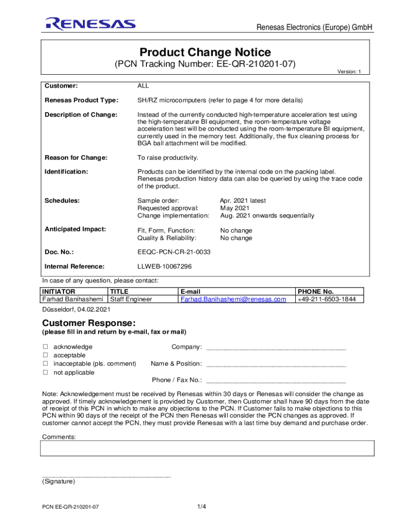 Genesis Electronics (Europe) Byproduct Change Notice (PCN Tracking Number: EEQR21020107) Version: 1Customer:Awareness Product Type:SH/OZ microcomputers (refer to page 4 for more details)Description