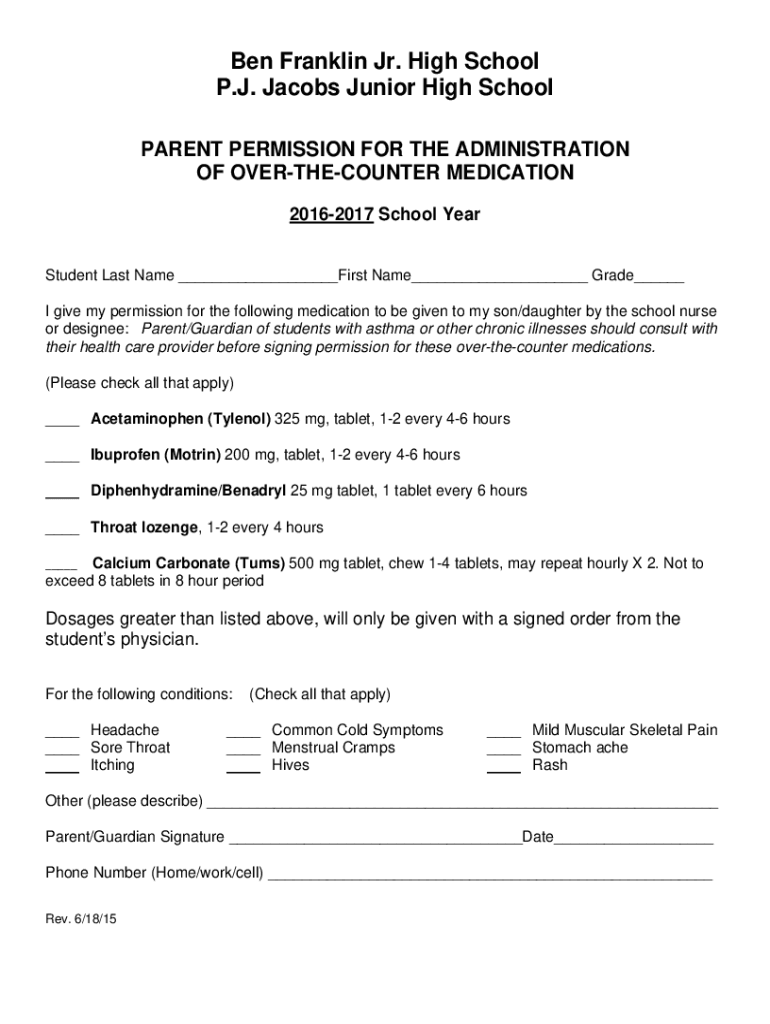 Ben Franklin Jr. High School P.J. Jacobs Junior High School PARENT PERMISSION FOR THE ADMINISTRATION OF OVERTHECOUNTER MEDICATION 20162017 School YearStudent Last Name ___First Name___ Grade___ I