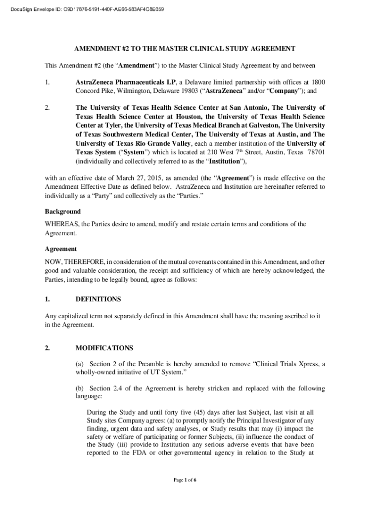 DocuSign Envelope ID: C9D178765191440FAE66583AF4C8E059AMENDMENT #2 TO THE MASTER CLINICAL STUDY AGREEMENT This Amendment #2 (the Amendment) to the Master Clinical Study Agreement by and between 1.