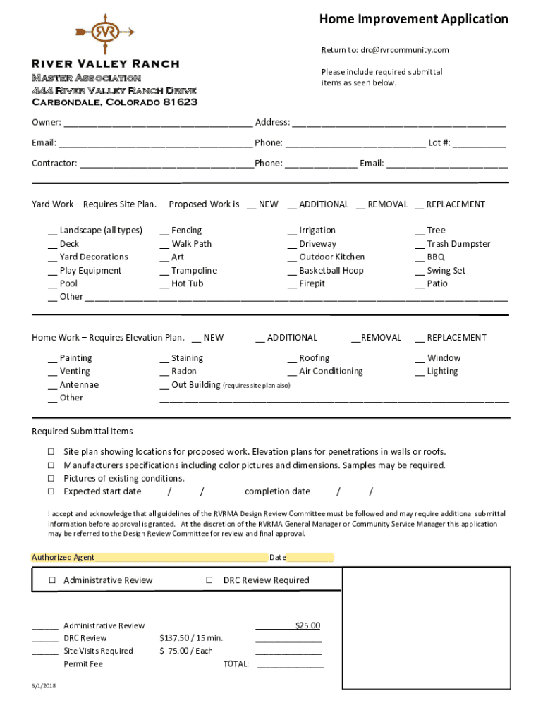 Home Improvement Application Return to: drc@rvrcommunity.com Please include required submittal items as seen below. Master Association 444 River Valley Ranch Drive Carbondale, Colorado 81623Owner: