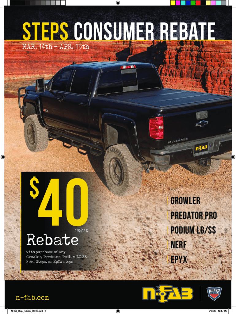 STEPS CONSUMER REBATE MAR. 14th APR. 15th$40US/CADRebatewith purchase of any Growler, Predator, Podium LG/SS, Nerf Steps, or Pyx steps| GROWLER | PREDATOR PRO | PODIUM LG/SS | NERF | EPYXnfab.com