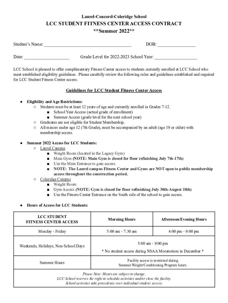 LaurelConcordColeridge School LCC STUDENT FITNESS CENTER ACCESS CONTRACT **Summer 2022** Students Name: ___ Date: ___DOB: ___Grade Level for 20222023 School Year: ___LCC School is pleased to offer
