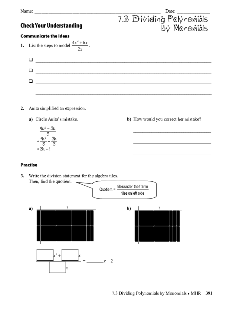 Name: ___Date: ___7.3 Dividing Polynomials by MonomialsCheck Your Understanding Communicate the Ideas 1. List the steps to model4 x2 + 6 ×. 2x___ ___ ___ ___ 2. Anita simplified an expression. a)