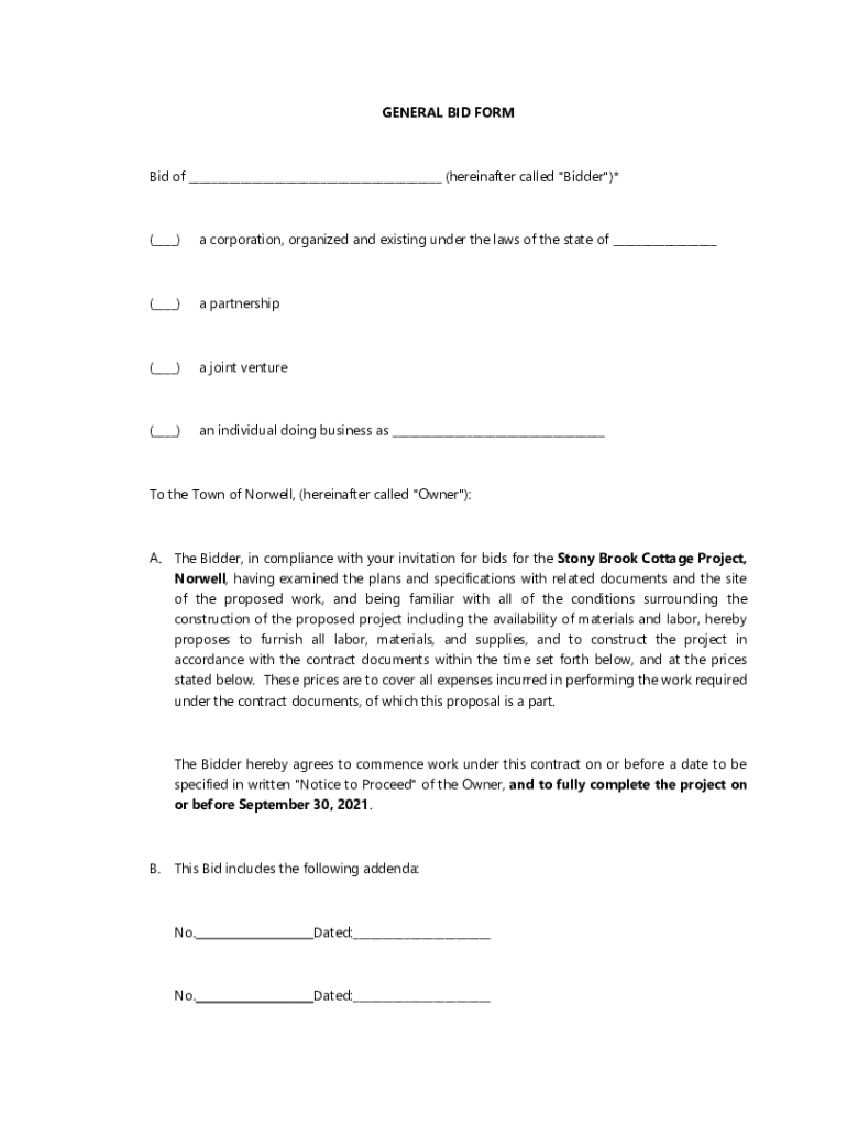 Get the free SECTION 00300 - GENERAL BID FORM - Town of Norwell MA