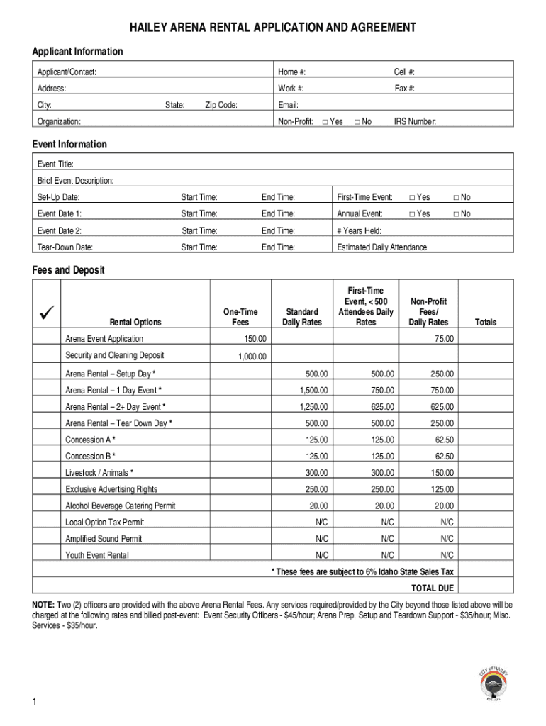 HAILEY ARENA RENTAL APPLICATION AND AGREEMENT Applicant Information Applicant/Contact:Home #:Cell #:Address:Work #:Fax #:City:State:Zip Code:Email:Organization:Nonprofit: Yes No IRS Number:Event Information