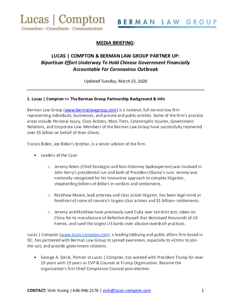 MEDIA BRIEFING: LUCAS | COMPTON & BERMAN LAW GROUP PARTNER UP: Bipartisan Effort Underway To Hold Chinese Government Financially Accountable For Coronavirus Outbreak Updated Tuesday, March 25, 20201.