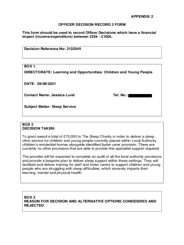 APPENDIX 2 OFFICER DECISION RECORD 2 FORM This form should be used to record Officer Decisions which have a financial impact (income/expenditure) between 25k 100k. Decision Reference No: 2122045BOX