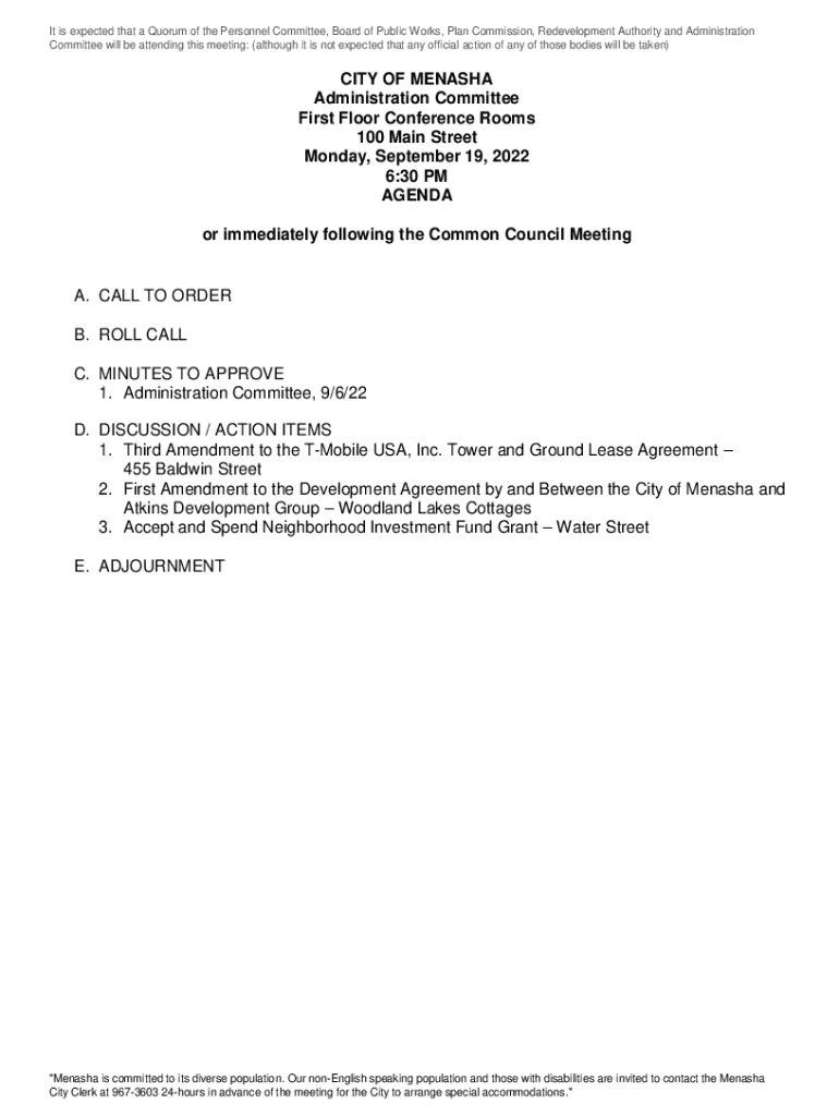 It is expected that a Quorum of the Personnel Committee, Board of Public Works, Plan Commission, Redevelopment Authority and Administration Committee will be attending this meeting: (although it is