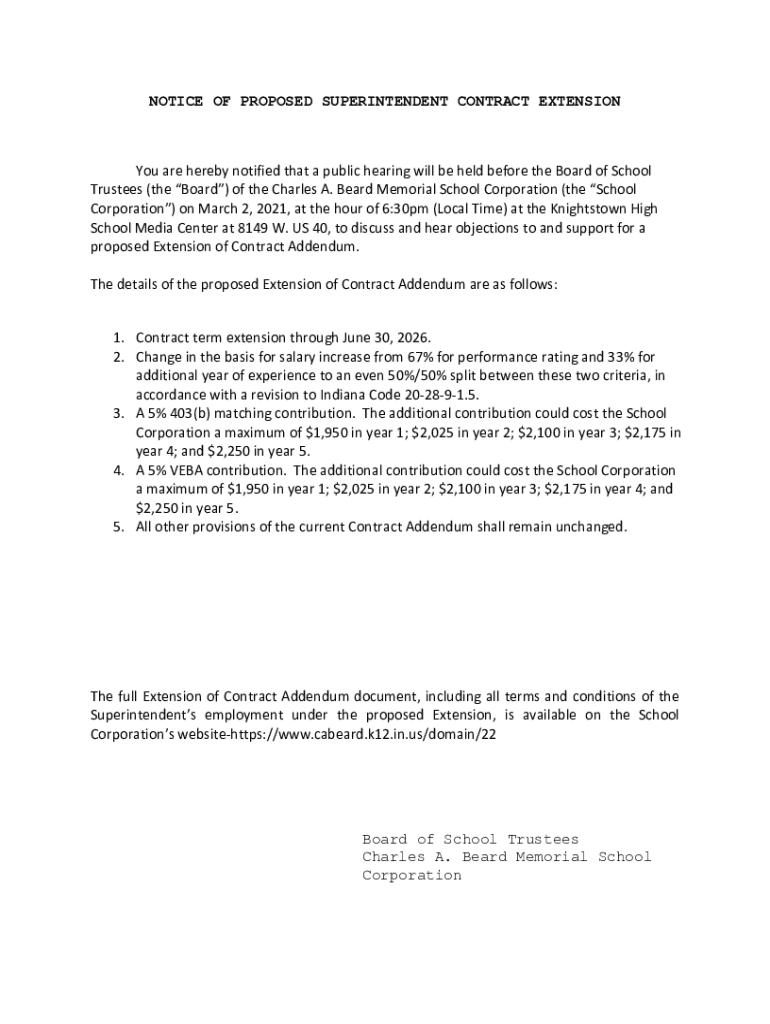 NOTICE OF PROPOSED SUPERINTENDENT CONTRACT Extension are hereby notified that a public hearing will be held before the Board of School Trustees (the Board) of the Charles A. Beard Memorial School