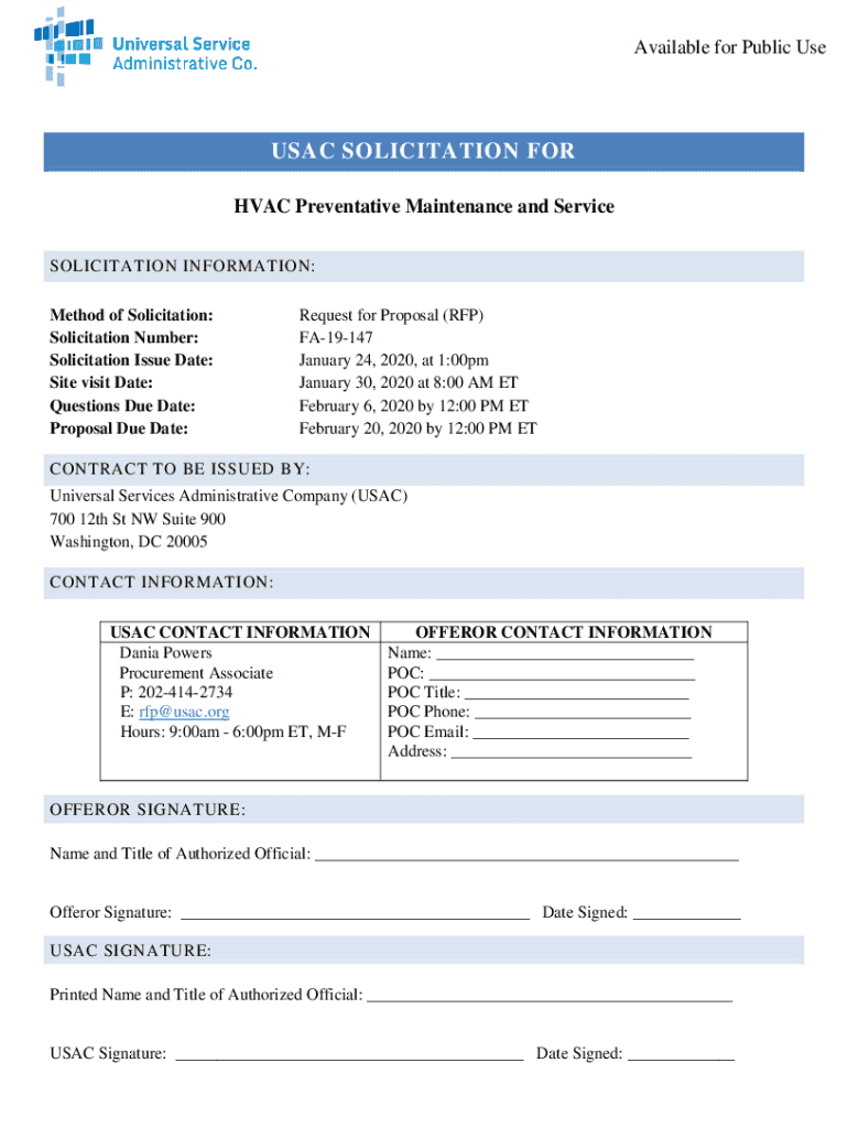Available for Public Uses SOLICITATION FOR HVAC Preventative Maintenance and Service SOLICITATION INFORMATION: Method of Solicitation: Solicitation Number: Solicitation Issue Date: Site visit Date: