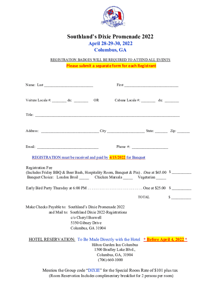 South lands Dixie Promenade 2022 April 282930, 2022 Columbus, GA REGISTRATION BADGES WILL BE REQUIRED TO ATTEND ALL EVENTSPlease submit a separate form for each RegistrantName: Last ___Venture Locale