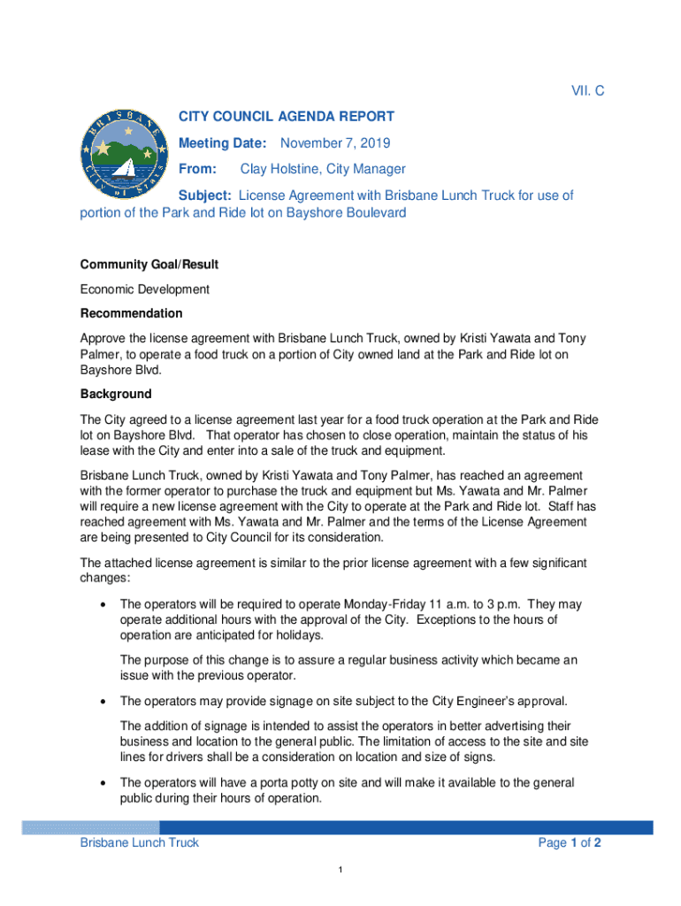 VII. C CITY COUNCIL AGENDA REPORT Meeting Date: From:November 7, 2019Clay Hols tine, City ManagerSubject: License Agreement with Brisbane Lunch Truck for use of portion of the Park and Ride lot on
