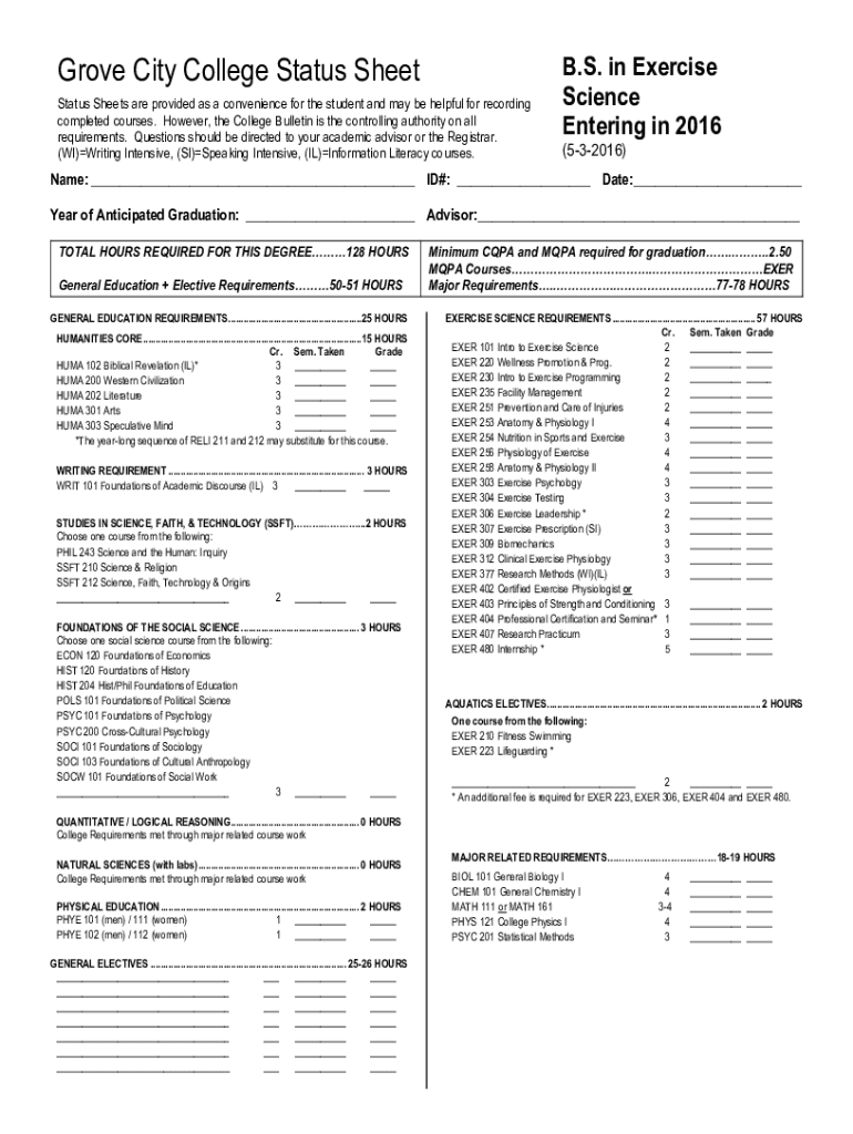 Grove City College Status Sheet Status Sheets are provided as a convenience for the student and may be helpful for recording completed courses. However, the College Bulletin is the controlling authority